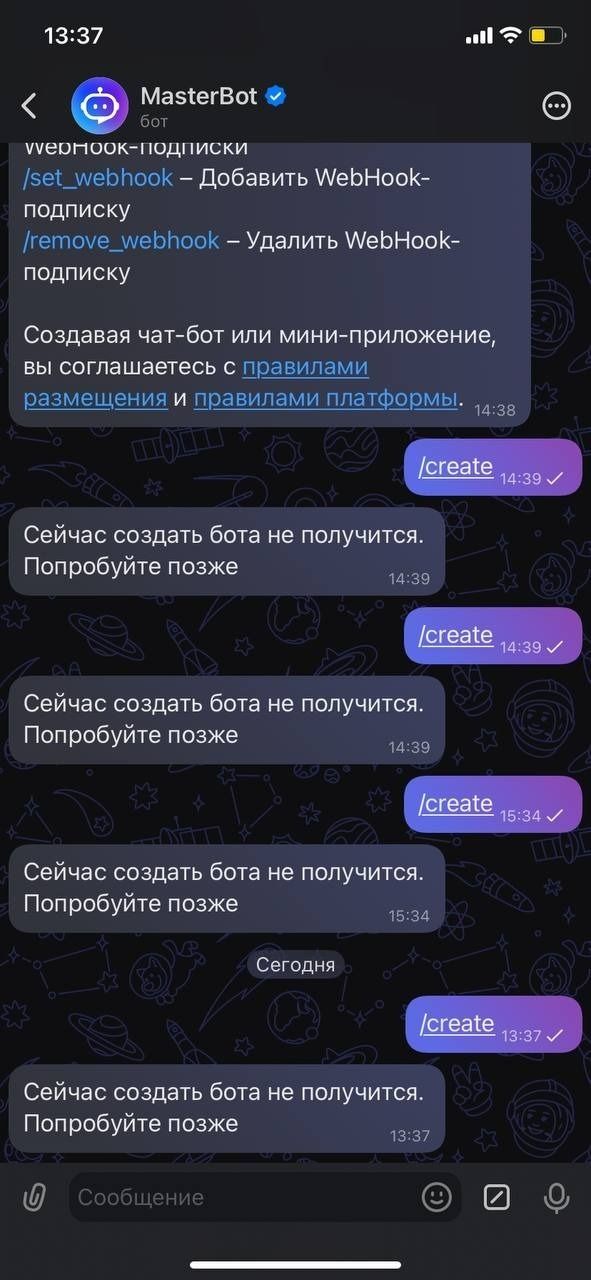 Теоретически в Max можно создать своего бота — но при попытке сделать это, задав команду /create в предназначенном для этого боте MasterBot, корреспондент «Медузы» получил ответ: «Сейчас создать бота не получится. Попробуйте позже».