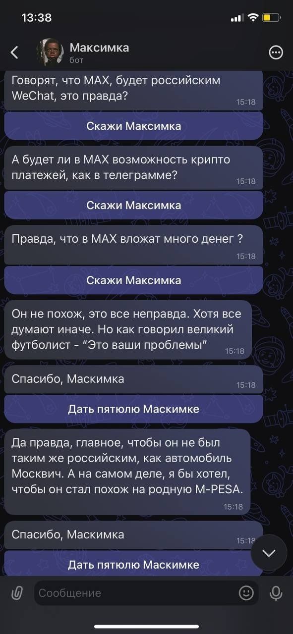 Один из немногих работающих ботов с вариативностью ответов называется «Максимка» и предлагает пользователю короткие ответы на вопросы «А правда за нами в Max будут следить?» (по версии бота, нет) и «Почему Max так похож на Telegram?».