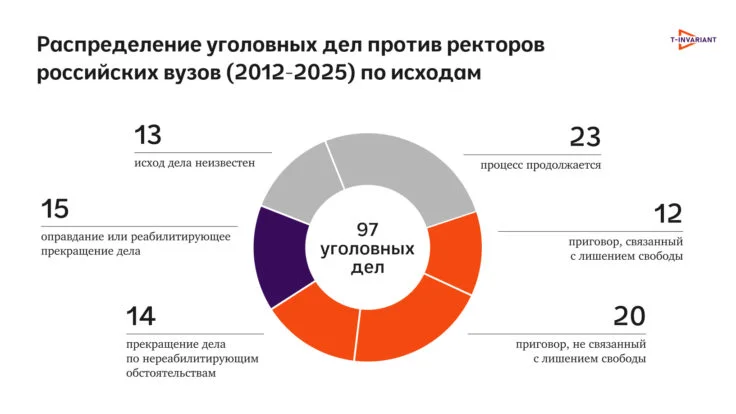 С 2012 по 2025 год в России возбудили уголовные дела против 97 ректоров вузов, большинство из них обвинили в экономических преступлениях. Об этом говорится в исследовании T-Invariant.