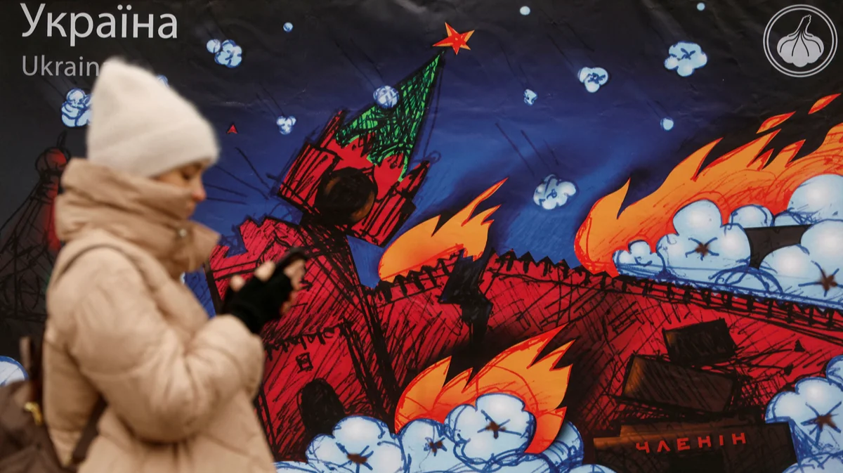 Репродукция почтовой марки с изображением горящего Кремля, Киев, Украина, 12 января 2023 года. Фото: Valentyn Ogirenko / Reuters / Scanpix / LETA