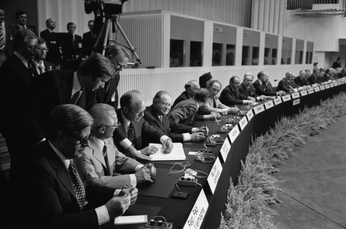 Заключительная стадия процесса состоялась в Хельсинки 30 июля — 1 августа 1975 года. В рамках Заключительного Совещания в Хельсинки главы государств и правительств 35 стран подписали Заключительный акт СБСЕ (Совещания по безопасности и сотрудничеству в Европе). В нём были закреплены «Декалог принципов» межгосударственных отношений (суверенитет, нерушимость границ, мирное разрешение споров, уважение прав человека и др.), договоренности о развитии экономических связей, обменах и научном сотрудничестве, а также обязательства расширять гуманитарные контакты и соблюдать основные права и свободы человека. Хотя документ имел политический, а не юридически обязательный характер, он стал важным символом «разрядки». Впоследствии для мониторинга соблюдения участниками принципов Соглашения была создана Организация по безопасности и сотрудничеству в Европе (1995).