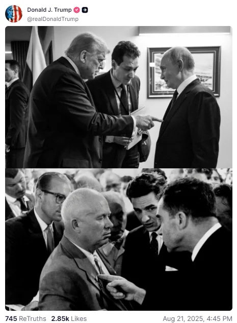 В другом сегодняшнем сообщении Трамп разместил рядом две фотографии: одну — с недавней встречи с Путиным на Аляске, другую — с так называемых «кухонных дебатов» 1959 года президента Никсона с первым секретарем ЦК КПСС Хрущевым на выставке в Москве. В обоих случаях американские президенты тычут пальцем в советских / российских лидеров.