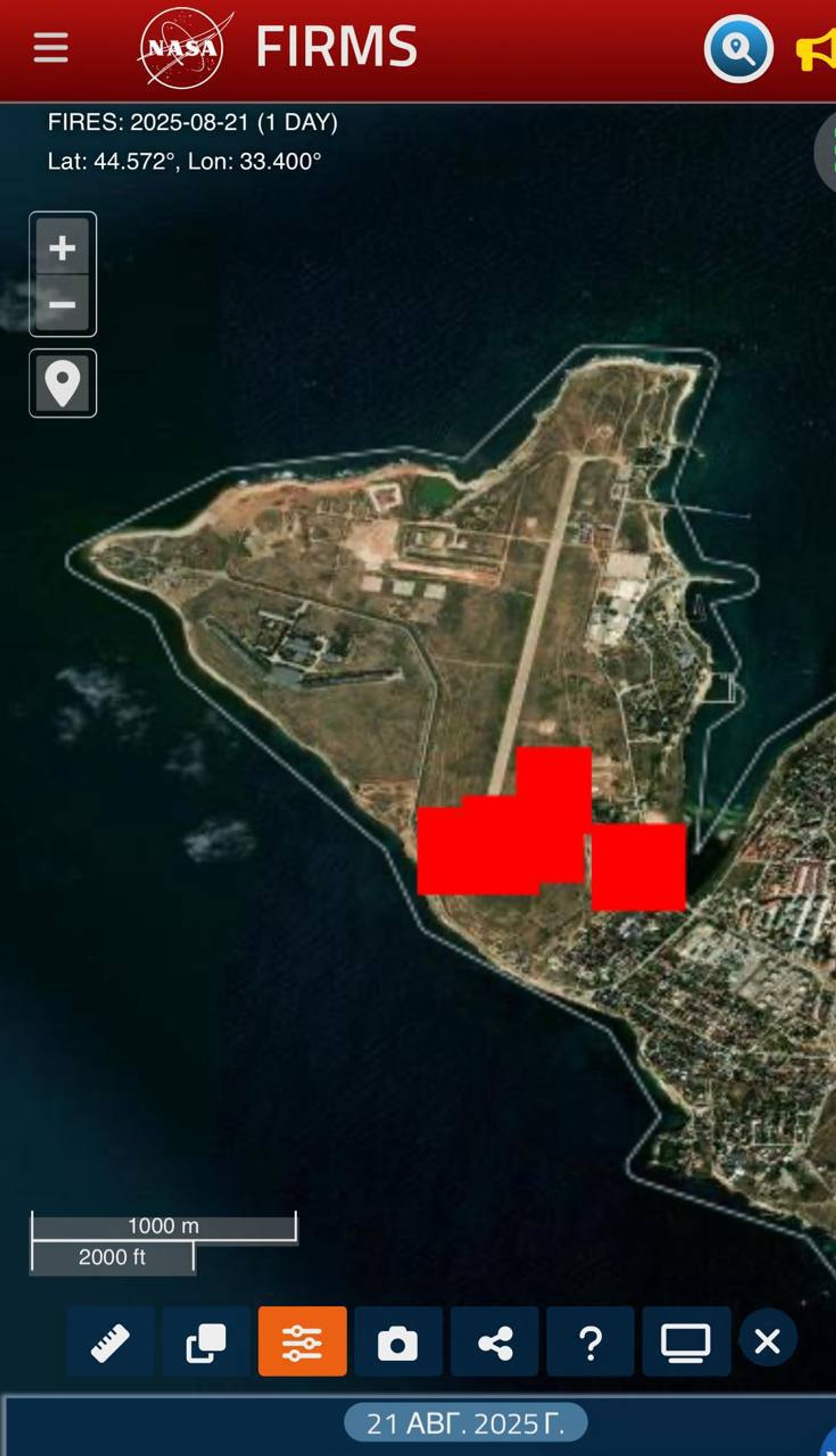Сигнатуры пожаров спутникового сервиса NASA FIRMS на месте недействующего аэродрома Херсонес под Севастополем
