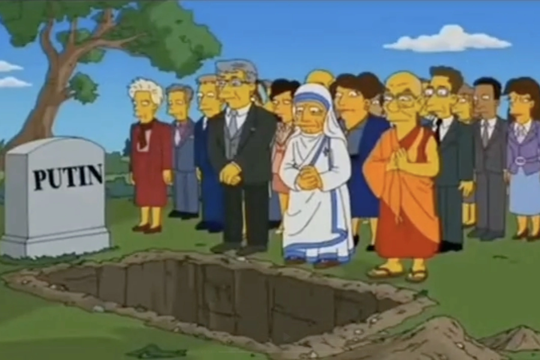 Отредактированный фрагмент из мультсериала «Симпсоны» завирусился в российском сегменте интернета несколько лет назад. В оригинальной версии герои сериала плюют на могилу богача мистера Бёрнса и на надгробии написано BURNS.