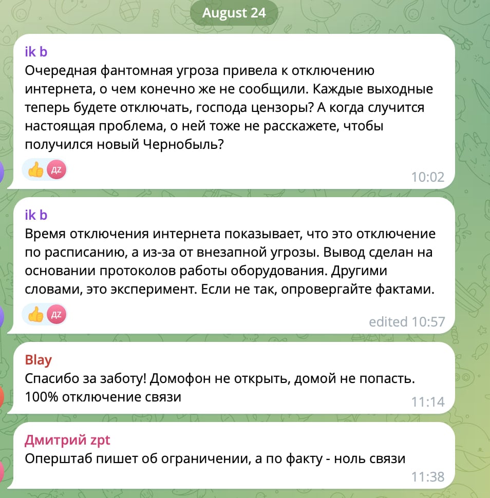 «Канцелярские отписки про "обеспечение безопасности" и ссылки на закон, без единого объяснения, что конкретно произошло и зачем душат интернет в регионе. Это выглядит как издевательство. "Мы не отключили, а только снизили скорость" — попробуй поработай или вызови такси на этой "скорости"», — написала она в личном телеграм-канале.