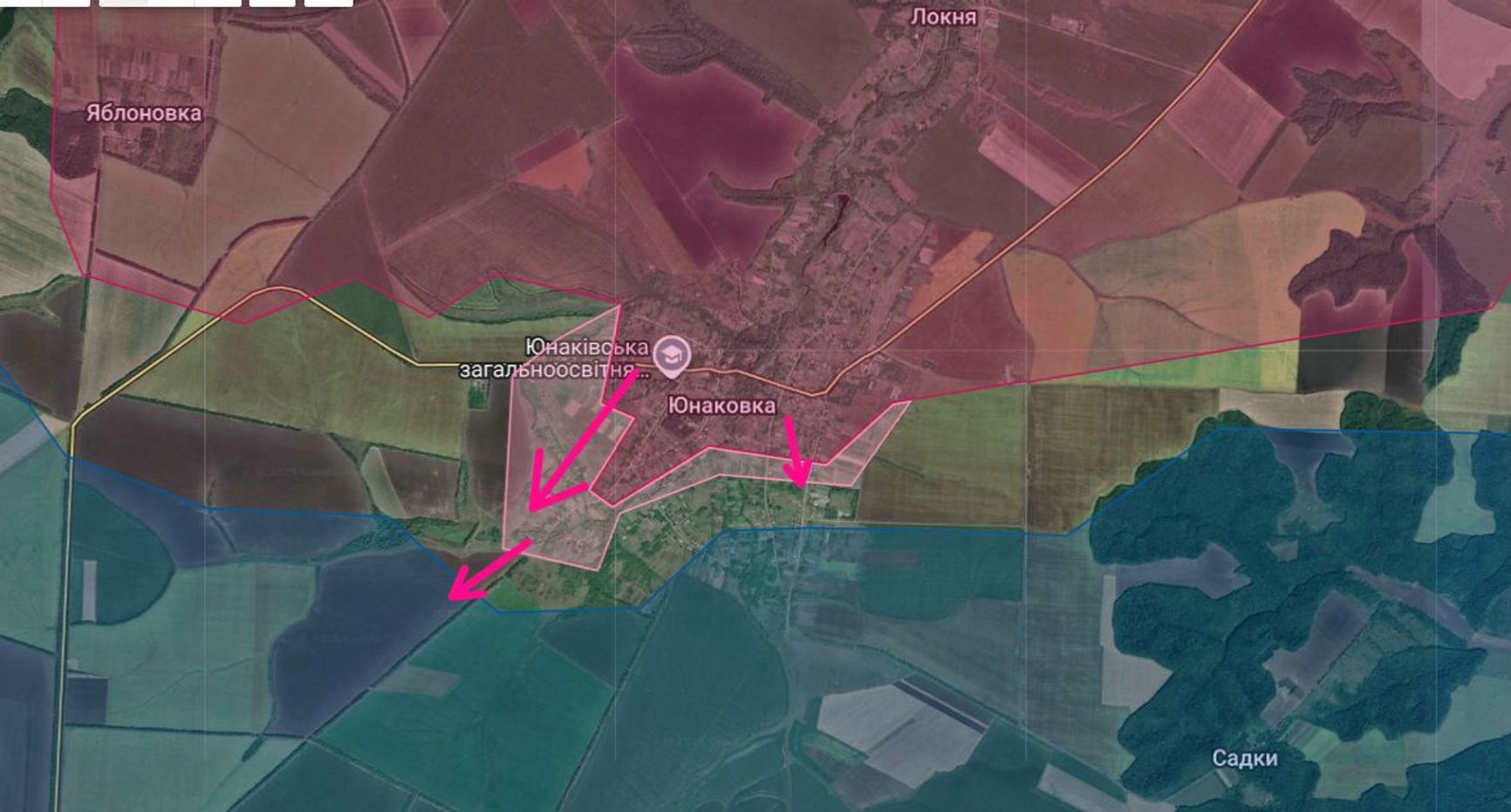DeepState сообщает, что СОУ оттеснили противника возле Андреевки в приграничье Сумской области, обходя с запада соседнюю Алексеевку. Российский военблогер Анатолий Радов, в свою очередь, отмечает дальнейшее продвижение ВС РФ в Юнаковке.