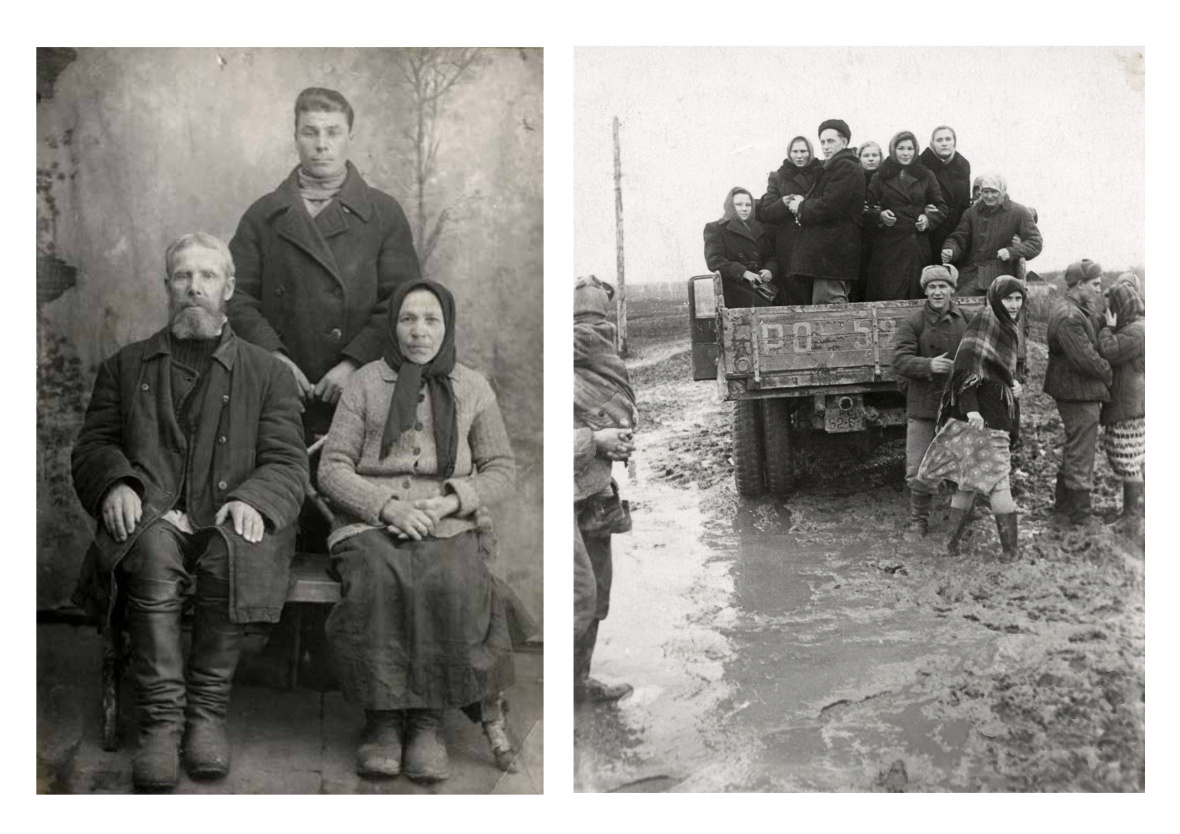 Слева: Раскулаченные, на обороте: «Родители в ссылке. Брат Ваня навестил их» | Справа: Колхозники в фуфайках месят осеннюю грязь. Похоже, их везут на лесозаготовки или в дальнюю бригаду. Кто-то уже залез в кузов грузовика, баба и мужик прощаются, она прячет лицо у него на груди