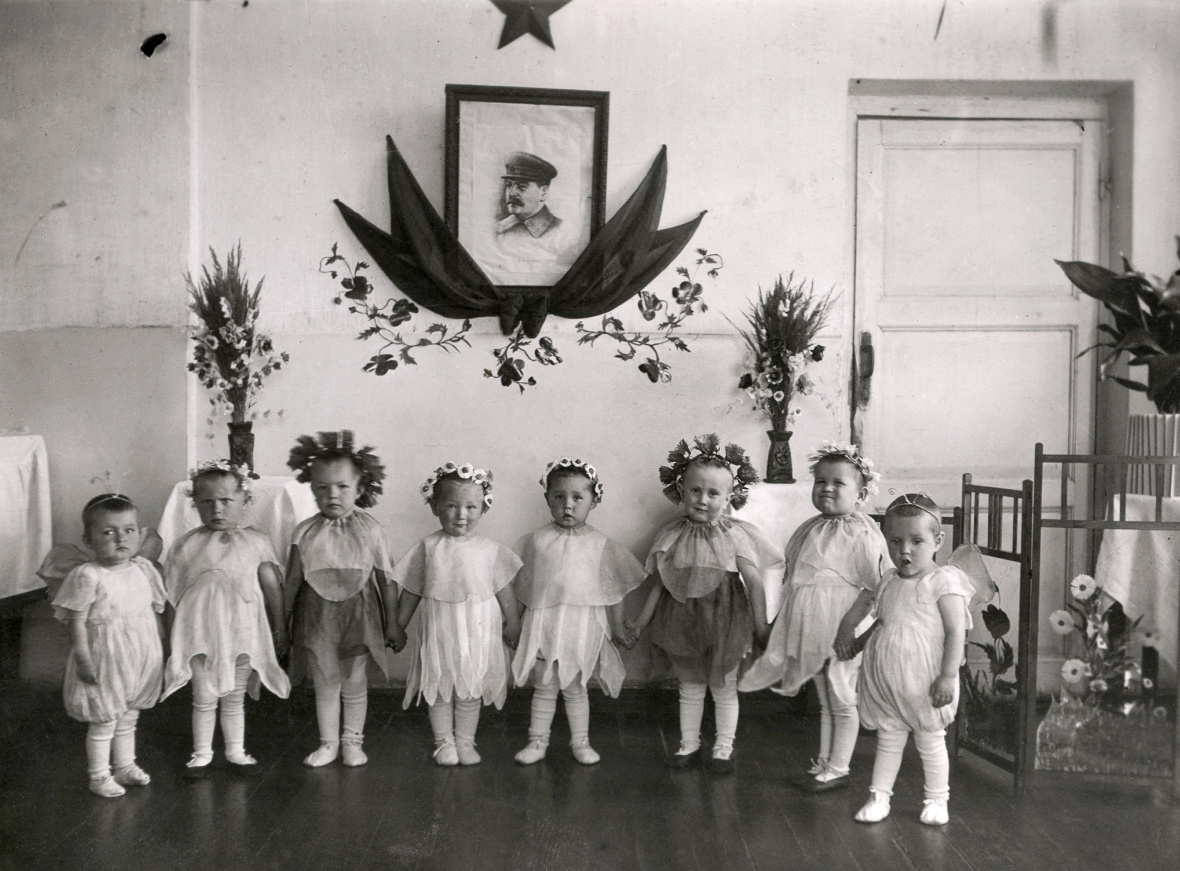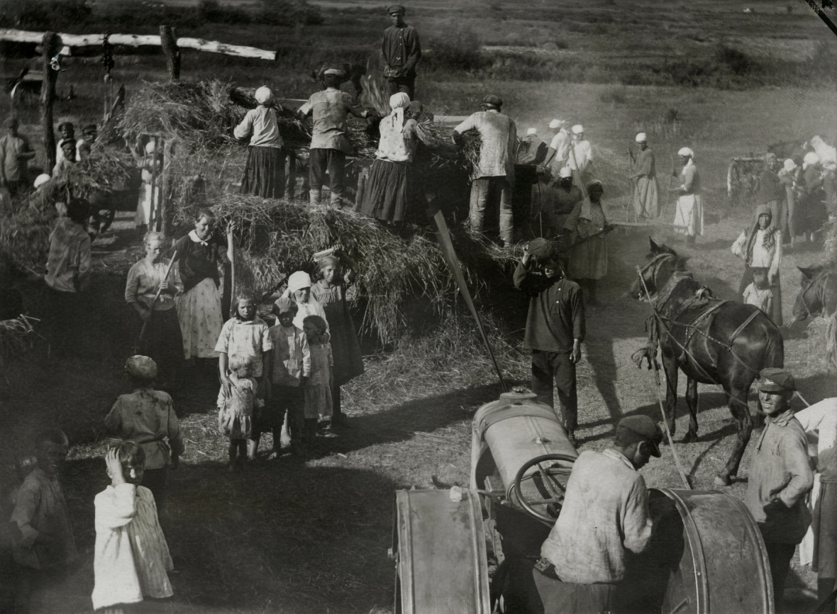 Молотилка в колхозе — куча баб, мужиков, детей что-то делают с сеном. Фотограф щелкнул случайно, когда еще никто не подготовился, половина стоит спиной. Эта фотка наверняка никуда не пошла — но именно она отражает время, еще не разрушенную деревенскую жизнь. Крестьян только что загнали обратно в рабство, но это дело привычное. Максимишин говорит: «А еще кайф этой картинки — они же крохотные, 6 на 9, скрученные, рваные. И когда засунешь в сканер, посмотришь на мониторе — а там целый роман, просто до мурашек…»