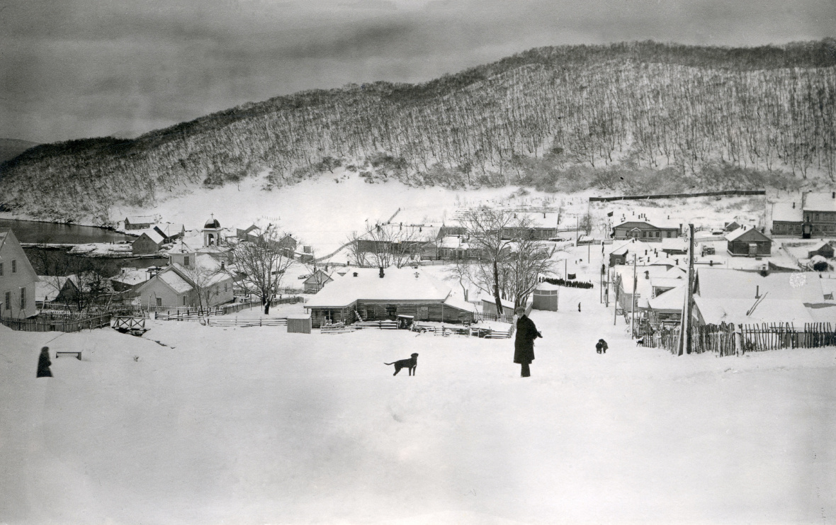 На фоне просторного, снежного брейгелевского пейзажа человек в меховой шапке гуляет с собакой, бабка идет по делам, играют дети, редеют деревья на сопке, стоит церковь, ты прямо слышишь карканье ворон. Только потом далеко внизу улицы ты замечаешь маленькую толпу с транспарантом. Оказывается, сюжет фото — октябрьская демонстрация в Петропавловске-Камчатском. Но как в «Падении Икара» у Брейгеля, ты видишь, настолько крохотны и ничтожны все эти амбиции и лозунги на фоне великой рутины повседневности
