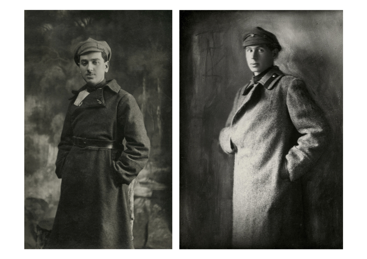 Две одинаковые карточки евреев-красноармейцев. Надев форму, оба пришли в ателье, и гордо, вполоборота позируют. Теперь они — полноправные граждане, мужчины, воины. На обороте одной карточки написано «Моей Голдочке» , другой — «Моей Ривочке»