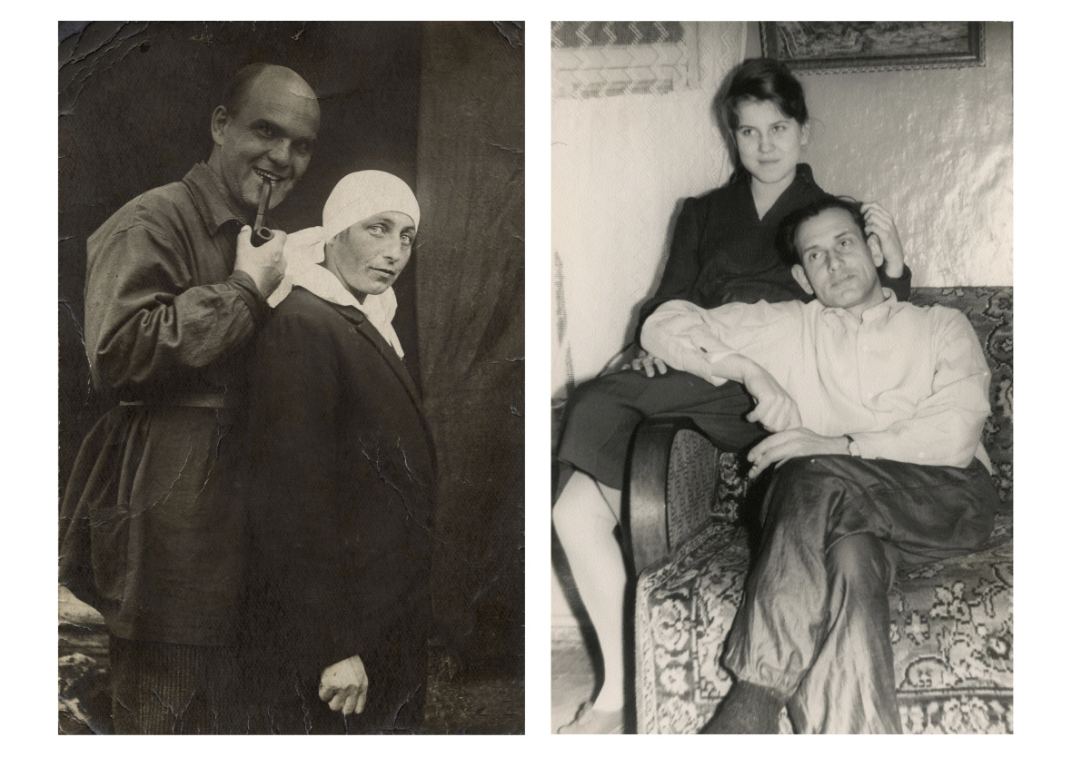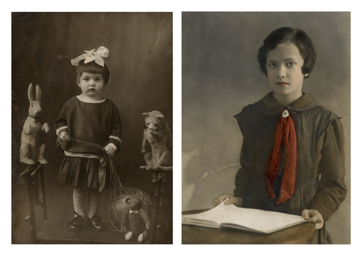 Слева: «Дорогой бабусиньке Фекле Василивне от твоей внучечки, красавицы Ниночки Лифляндчик» — четырехлетняя девочка с бантиками в молчаливом, загадочном окружении странных, шванкмайеровских кукол — кролика, кота и медведя. Они одновременно неживые и живые, и что-то безмолвно говорят — и бабусеньке, и нам | Справа: Черно-белое фото красивой, серьезной пионерки, галстук и губы на карточке подкрашены красным