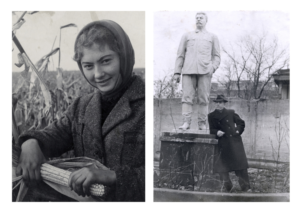 Слева: Студентка с початком кукурузы, глаза, как у Белки в «Летят журавли» | Справа: Оттепель, мужик с цигаркой развязно прислонился к памятнику Сталина
