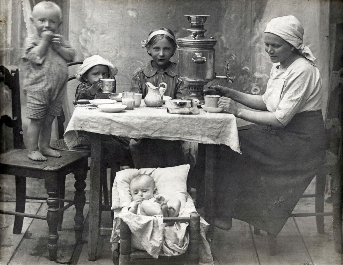 Женщина крестьянского вида, босая и в платке, с двумя детьми, пьет за столом чай из самовара. Рядом со столом — младенец в люльке. Однако вся эта милая сцена происходит в фотоателье, мы видим характерный задник