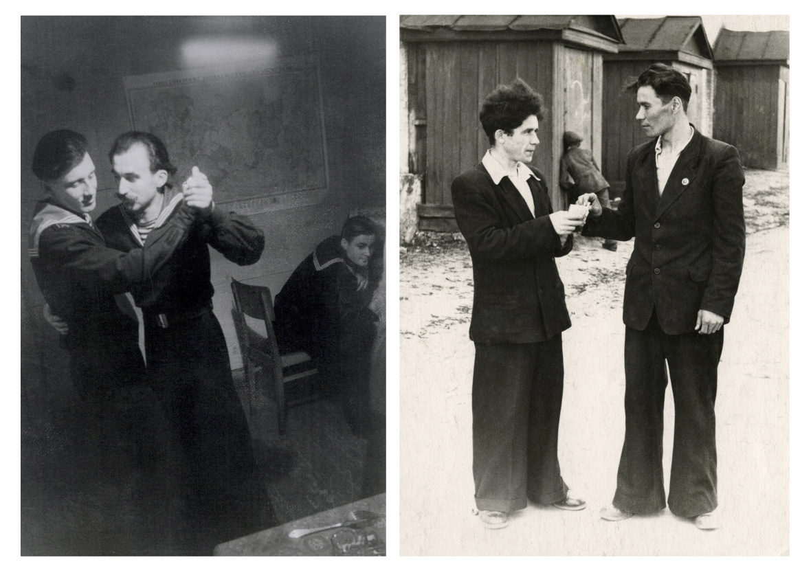 Один молодой рабочий угощает другого папироской. Это воскресенье — оба в пиджаках и расклешенных брюках. На заднем плане незаметный для фотографа мальчишка подглядывает в щелочку душа или туалета (Картье-Брессон, снова привет!) Двое матросов, обняв друг друга за талию, танцуют вальс. Три студентки щекочут друг друга на пружинной кровати под ковриком с тремя богатырями. Двое парней, с прическами а-ля Битлы и в клешах, держат портрет Брежнева. Жена одного неловко присела, чтобы не заслонять генсека. Очкастый еврей обмывает диссертацию, устало и умиротворенно курит за столом. Коллега, обняв его за плечи, поднимает бутылку водки.