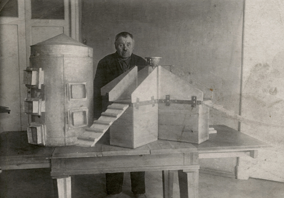 Пожилой мужчина, потупившись, демонстрирует агрегат, похожий на пирамиду майя. Подпись: «Это мой дедушка Сергей Кондратьевич Кузьмин. Он изобрел этот прибор для ловли крыс! Они очень много заполняли улицы». Слева — крематорий для попавшихся зверьков