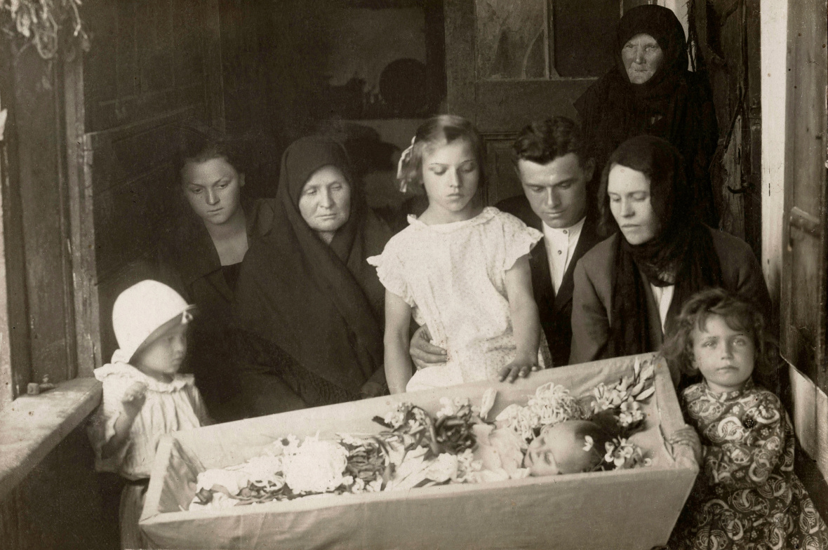 Семья глядит в детский гробик. Одна маленькая девочка очень удивлена, вторая — единственная из семьи — глядит на фотографа, она не до конца осознала случившееся и просто довольна всем этим движем. Сзади стоит старая, похожая на смерть бабка с колючим, ожесточившимся от горя взглядом. Фото очень похоже на картину Рембрандта