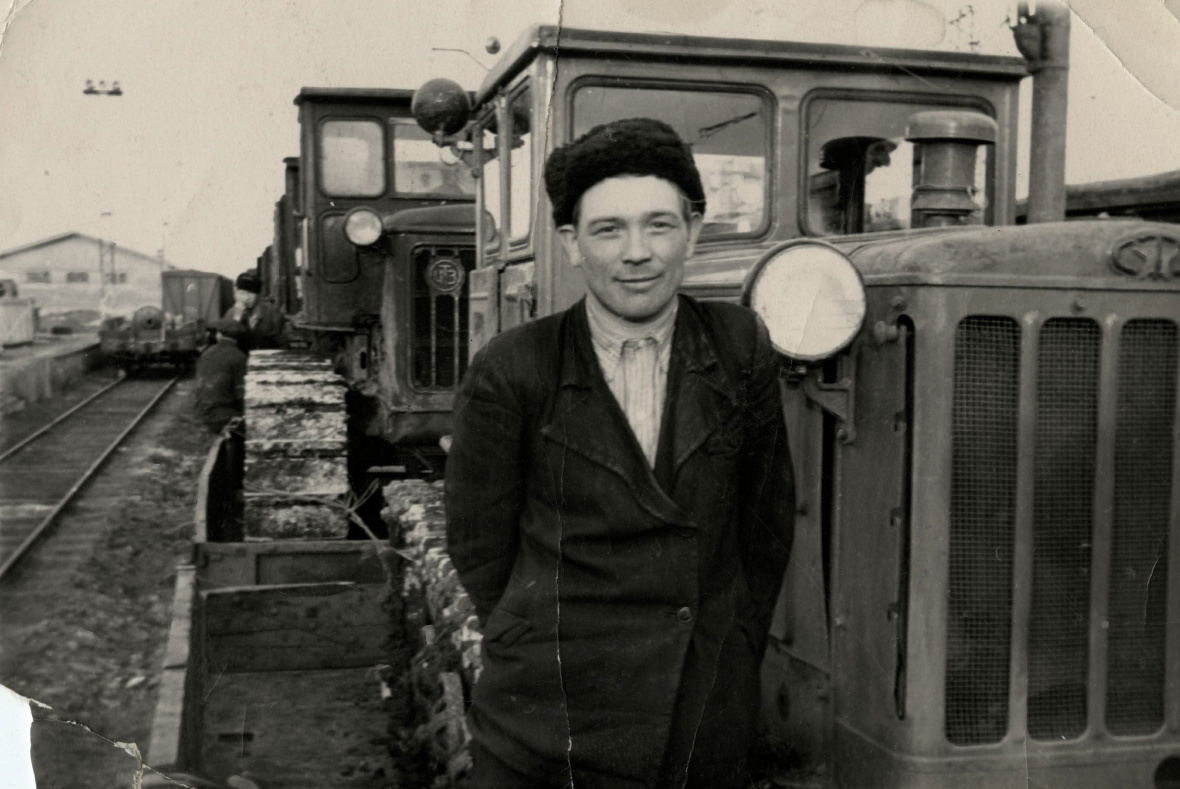 Тракторист у трактора, в пиджаке и шапке, похож на Шукшина. Рубашка застегнута на верхнюю пуговицу — мой дед тоже так ходил