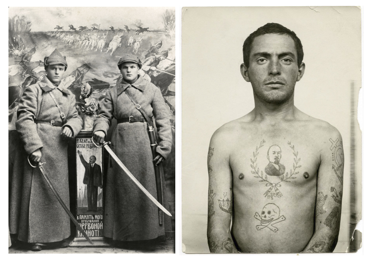 Слева: После революции люди вдруг начинают фотографироваться с оружием, раньше такого не было. Напор, отпор, люди хотят показать, что постоят за себя в это сложное время | Справа: В камеру с дерзким вызовом глядит урка, весь в наколках. На животе — «Адамова голова», как под православным распятием, символ грешного человечества. Над ним — портрет Ленина в траурном венке. 1926-й, Ильич умер всего два года назад, но сразу стал предметом культа. Что заставило киевского квартирного вора набить себе портрет вождя пролетариата? Да еще с таким понтом, что он — искупитель грехов наших. Что-то ведь заставило.