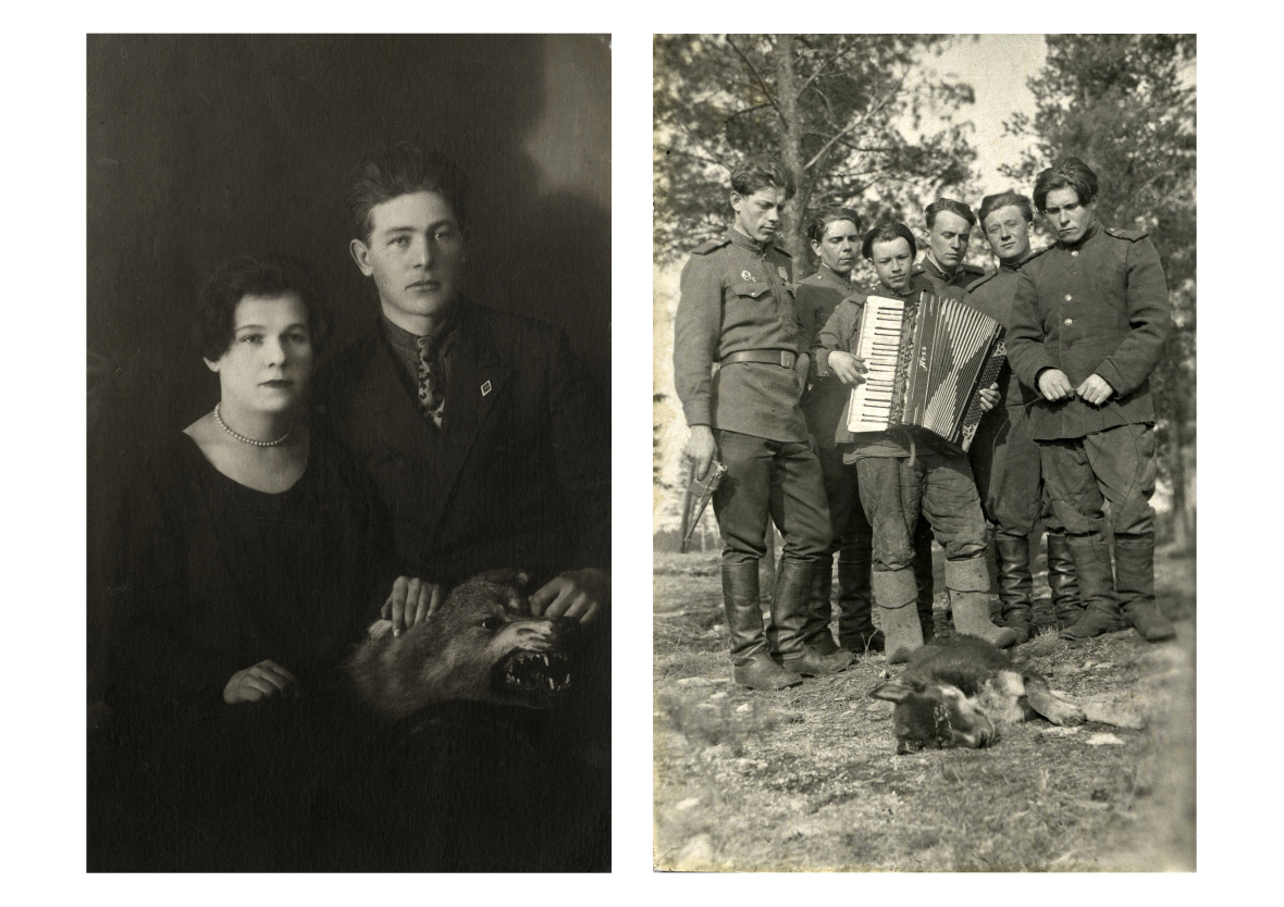 Слева: Семейная пара в строгих платьях сидит в ателье, на коленях мужчины — оскаленная голова волка. Из них троих только у него есть выражение. | Справа: Группа солдат с баяном исполняет траурный марш по убитой собаке. У одного из них в руках пистолет — возможно, застрелил, чтобы не мучилась. Подпись: «Вечная память»