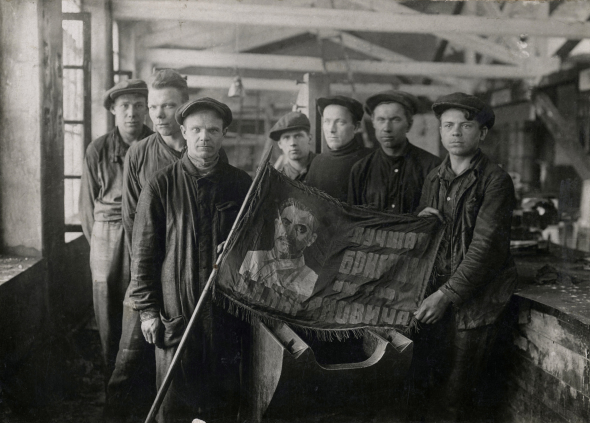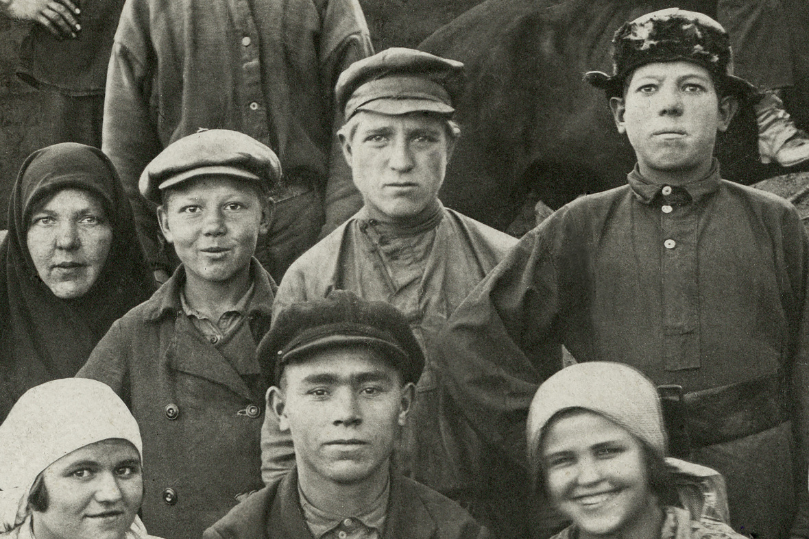 Фото бригады им. Лазаря Кагановича: волевой бригадир-карьерист держит флаг, цепко глядя в камеру. Рядом наивный, на все согласный подросток с мечтательным лицом. Из-за спины бригадира — хитрый взгляд скептика, похожего на Славу КПСС, который все это на х*ю вертел. За ним — рассеянно смотрит затюканный, подневольный олух, которого первым сдадут в (на) органы. По взгляду Кагановича на знамени видно, что ему на все плевать