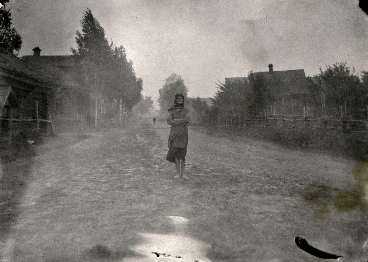 «Родина» — это медленное чтение: чтобы въехать, каждый снимок нужно внимательно разглядеть. Учительница позирует со школьниками, делая вид, что читает им вслух. Книга перевернута вверх ногами. Раскулаченный дед глядит на фотографа послушно, как ребенок, положив ладони на колени, — он больше не кулак. Босая тетка в развевающемся платке стоит посреди пустой деревенской улицы. Летит, поднятый сильным ветром, песок, наверное, будет ливень.