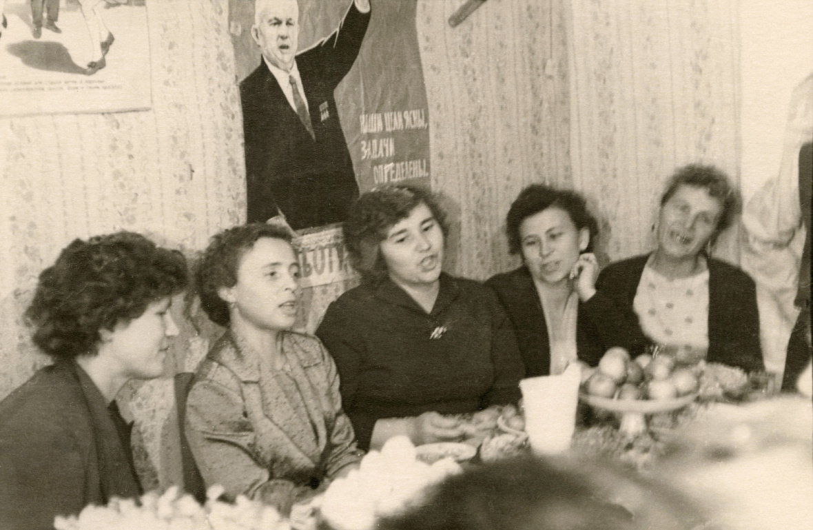 Застолье, женщины поют мечтательно и душевно. На вздувшихся обоях над ними — плакат с Хрущевым: «Наши цели ясны, задачи определены. За работу, товарищи!»
