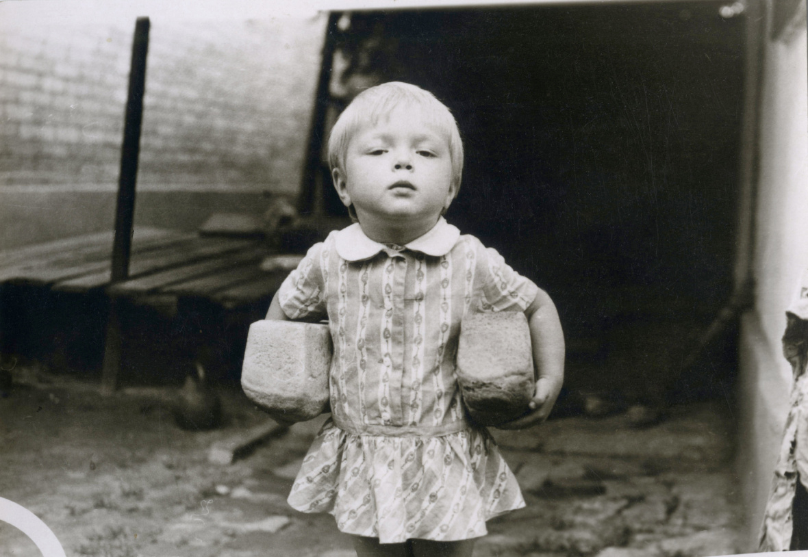 Маленькая девочка тащит под мышками две буханки хлеба — с тем же восторгом, что и у мальчишки Картье-Брессона, несущего две бутыли вина. «Я тебе не скажу, что мама торт купит», — написано на обороте.