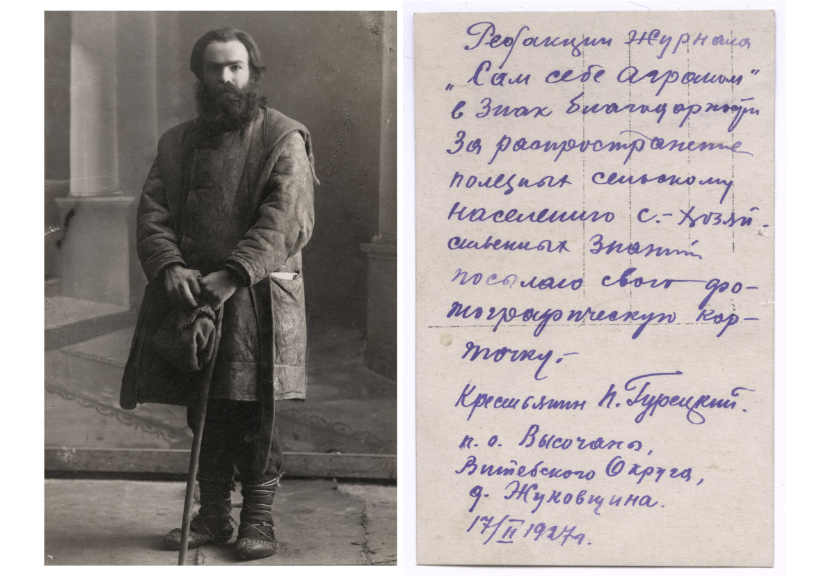 Изредка Максимишину удавалось найти какие-то сведения о людях, изображенных на фото. Вот карточка крестьянина с умным лицом, которую он послал в редакцию журнала «Сам себе агроном» — в знак благодарности за распространение полезных сельскому населению сельскохозяйственных. Сергей нашел этого крестьянина в базе «Мемориала»* — в 1932 году он получил 10 лет лагерей, дальше судьба неизвестна.