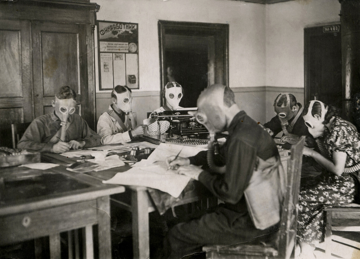 Совслужищие склонились над бумагами в противогазах — в рамках учений по гражданской обороне. На стене газета «Финработник» — это, похоже, банк