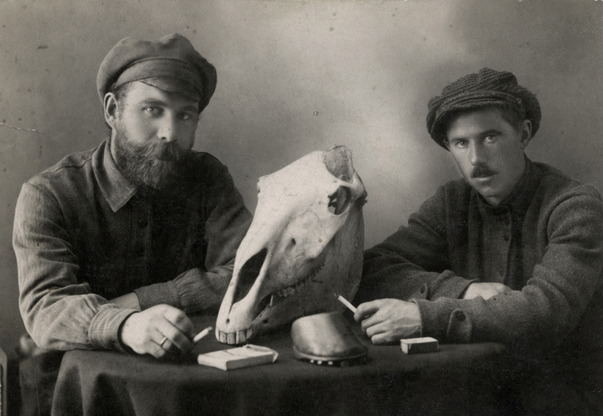 Двое мужчин, сидя за столом, смотрят в кадр. Между ними откуда-то из вечности, с ехидной усмешкой глядит на нас череп коня, придавая снимку сюрреалистичный (как на коллажах Макса Эрнста) и вместе с тем эпический (как в «Песни о вещем Олеге») оттенок. На обороте: «В память о нашей совместной работе по военно-конскому переучету»