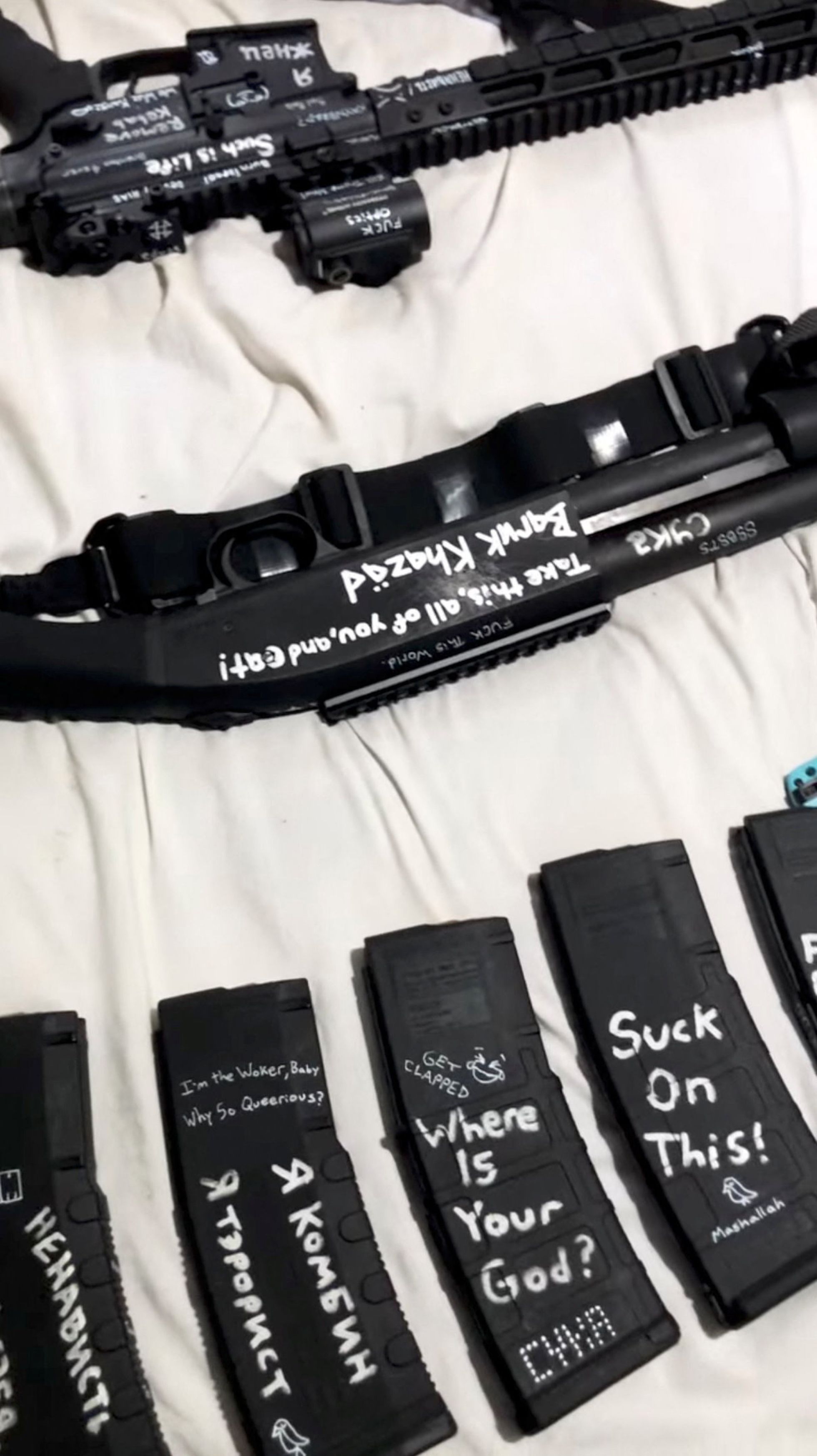 Речь идет о серии видео, — они уже удалены — в которых подозреваемая показывает свой арсенал оружия и дневник. Он написан на английском, но кириллицей («Я ам а wортhлес лузэр»), хотя встречаются и фрагменты на русском («Кто я? Когда это закончится?»). Свое оружие Уэстман также покрыла надписями по-русски («Водка и РЭБ») и именами массовых убийц. Среди них оказался Владислав Росляков — студент Керченского колледжа, который в 2018 году убил 20 человек в своем учебном заведении, а потом покончил с собой.
