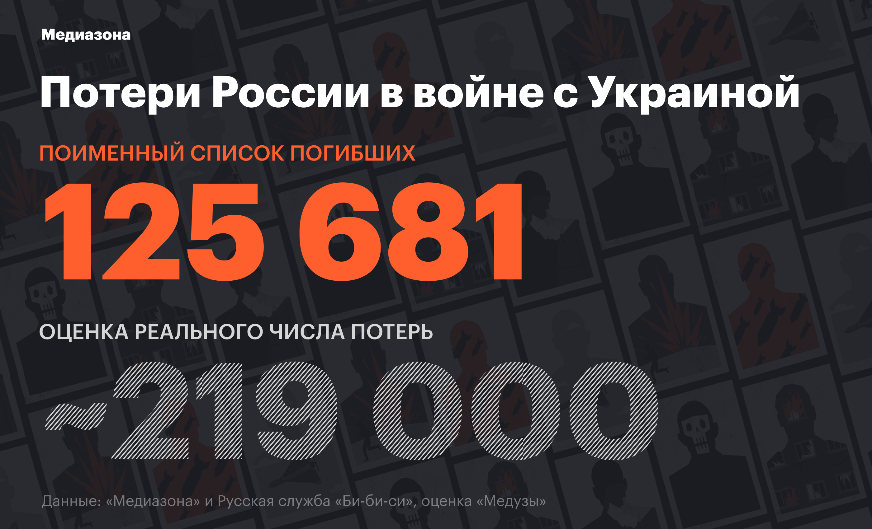 В поименном списке погибших на конец августа 2025 года 125 681 человек. Мы ведем его по открытым источникам (некрологи, сообщения в СМИ и так далее). Очевидно, что это число не отражает все потери: далеко не о каждой смерти становится известно публично.