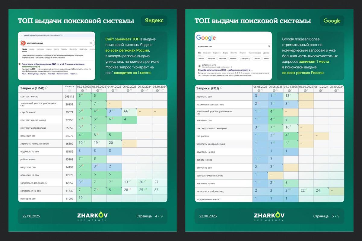 За несколько месяцев на сайте появились сотни страниц, содержащие в заголовке названия крупнейших городов и регионов России вместе с типовой фразой «Контракт на СВО». «Если вы наберете “служба по контракту” в любом регионе России, где бы вы ни находились, на первых местах увидите сайт моего клиента», — рассказывает Жарков.