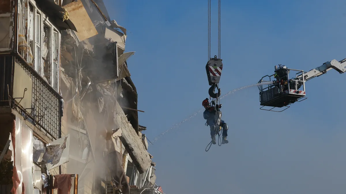 A Ukrainian rescue worker is lowered to the site of a Russian airstrike on a residential building in Kyiv, Ukraine, 28 August 2025. Photo: EPA/SERGEY DOLZHENKO