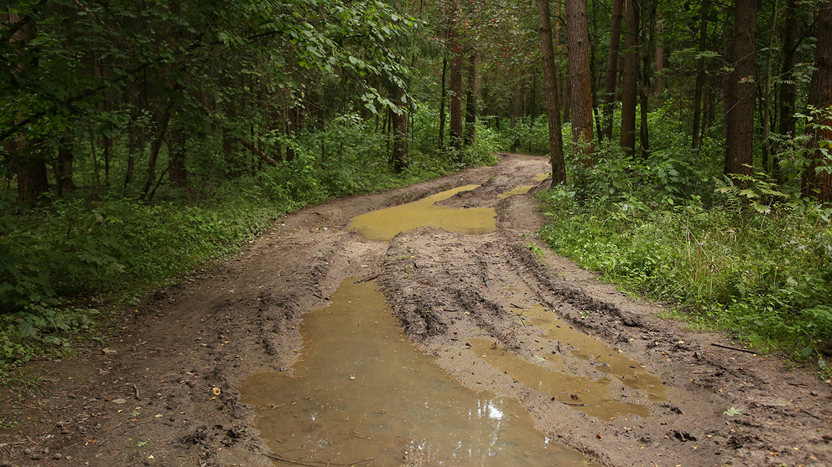 Там, где асфальт заканчивается, в лесной чаще виднеется грунтовая просека с наваленной поверх земли асфальтовой крошкой — той самой, разгрузку которой пытались остановить местные жители.