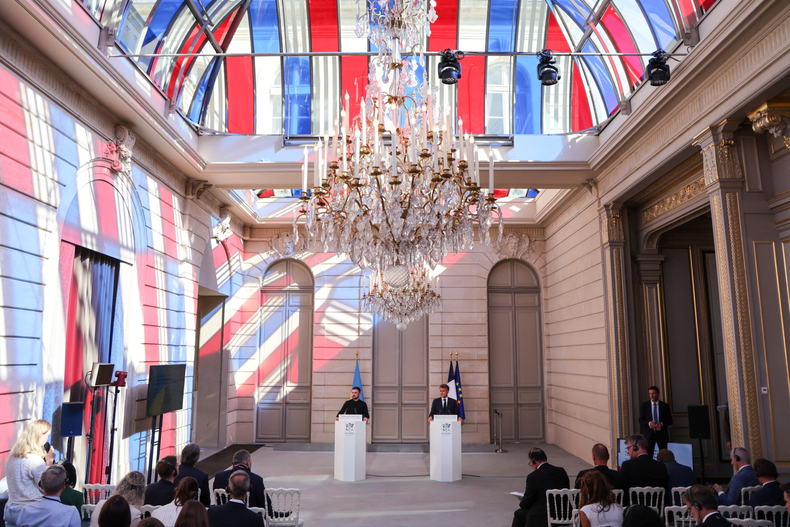 Фото: Президент Украины Владимир Зеленский и президент Франции Эммануэль Макрон принимают участие в пресс-конференции по итогам саммита «коалиции желающих» в Елисейском дворце в Париже, Франция, 4 сентября 2025 года. LUDOVIC MARIN/Pool via REUTERS