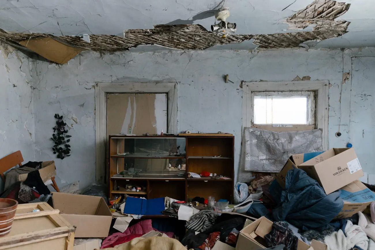 В квартире Митиных темно: окна на две трети заколочены фанерой. Лампочки выкручены. Пол завален одеждой, коробками, тарелками, мешками и банками. Советские тарелки с голубым узором. Пульт от телевизора. Круглая печь из последних сил держит на себе осыпающийся потолок из дранки. В шифоньере несколько вязаных цветных поясков, в кухонном шкафчике — баночка с абрикосовыми косточками, со стен свисают пучки сушеных трав. С потолка кухни падают капли дождя.