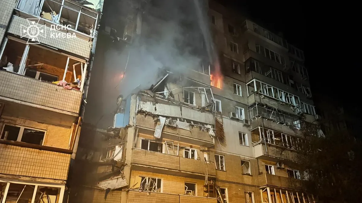 Под удар, в частности, попали девятиэтажный жилой дом в Святошинском районе и четырехэтажный дом в Дарницком районе. Также обломки БПЛА впервые упали на здание правительства Украины, рассказала премьер-министр Юлия Свириденко. Загорелись верхние этажи здания и крыша.