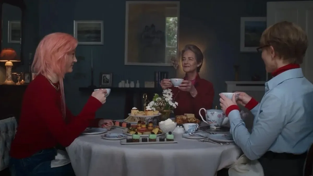 Тут чокаются водой, тосты поднимают чашкой с кофе. Тут рифмуются детали — одинаковый цвет одежды родственников комментируется со смешком. Чайный стол наряжается пирожными, как клумбы с цветами. Про часы Rolex выясняют постоянно и бегло: настоящие они или подделка. Никаких отсылок к семейному кризису. Никакого доморощенного психоанализа.