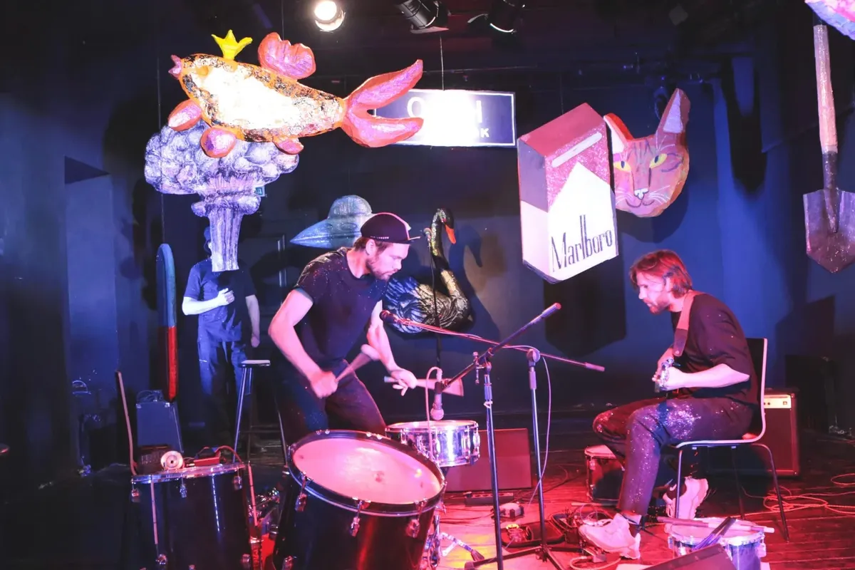 Музыканты в этом джем-сейшне немного безумные: по ходу действия все время что-то перенастраивают, роняют… «Кабаре из бутылок и окурков — философия новых переулков».