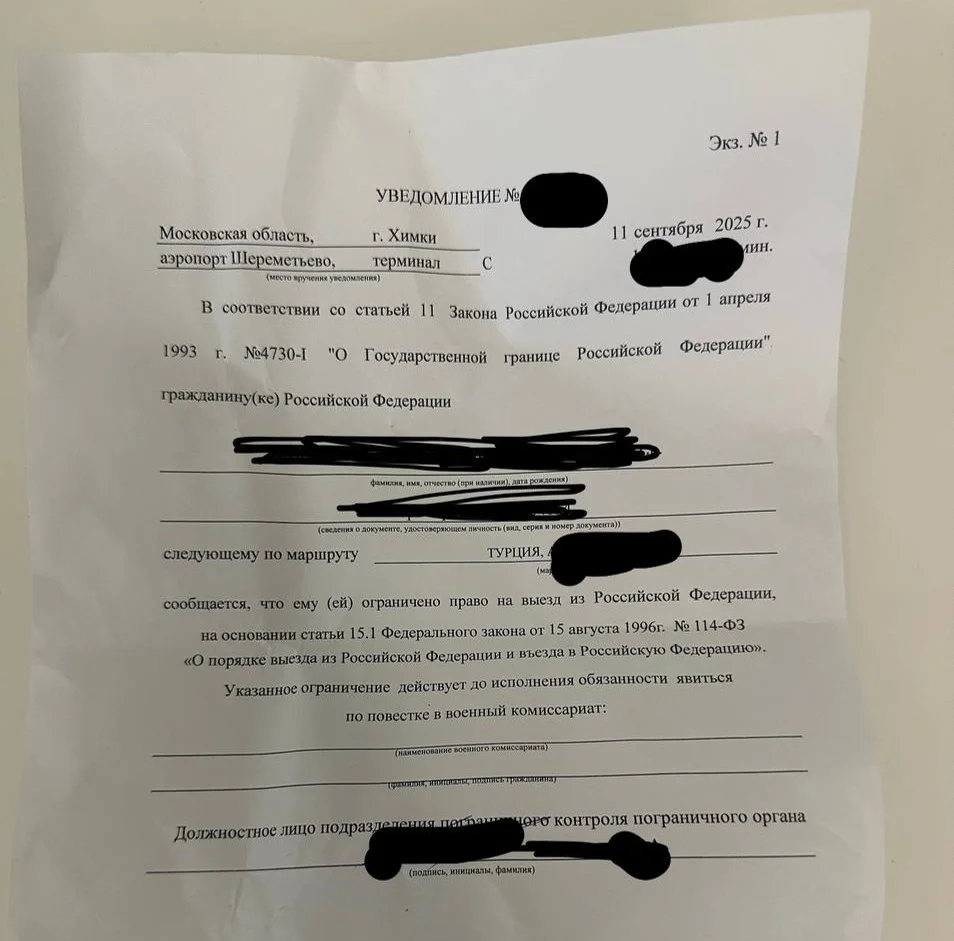 28-летнему жителю Краснодарского края запретили вылет из России в Турцию на основании врученной электронной повестки, рассказал он сам телеграм-каналу «Пограничный контроль», прикрепив «уведомление» выданное ему в аэропорту Шереметьево 11 сентября.