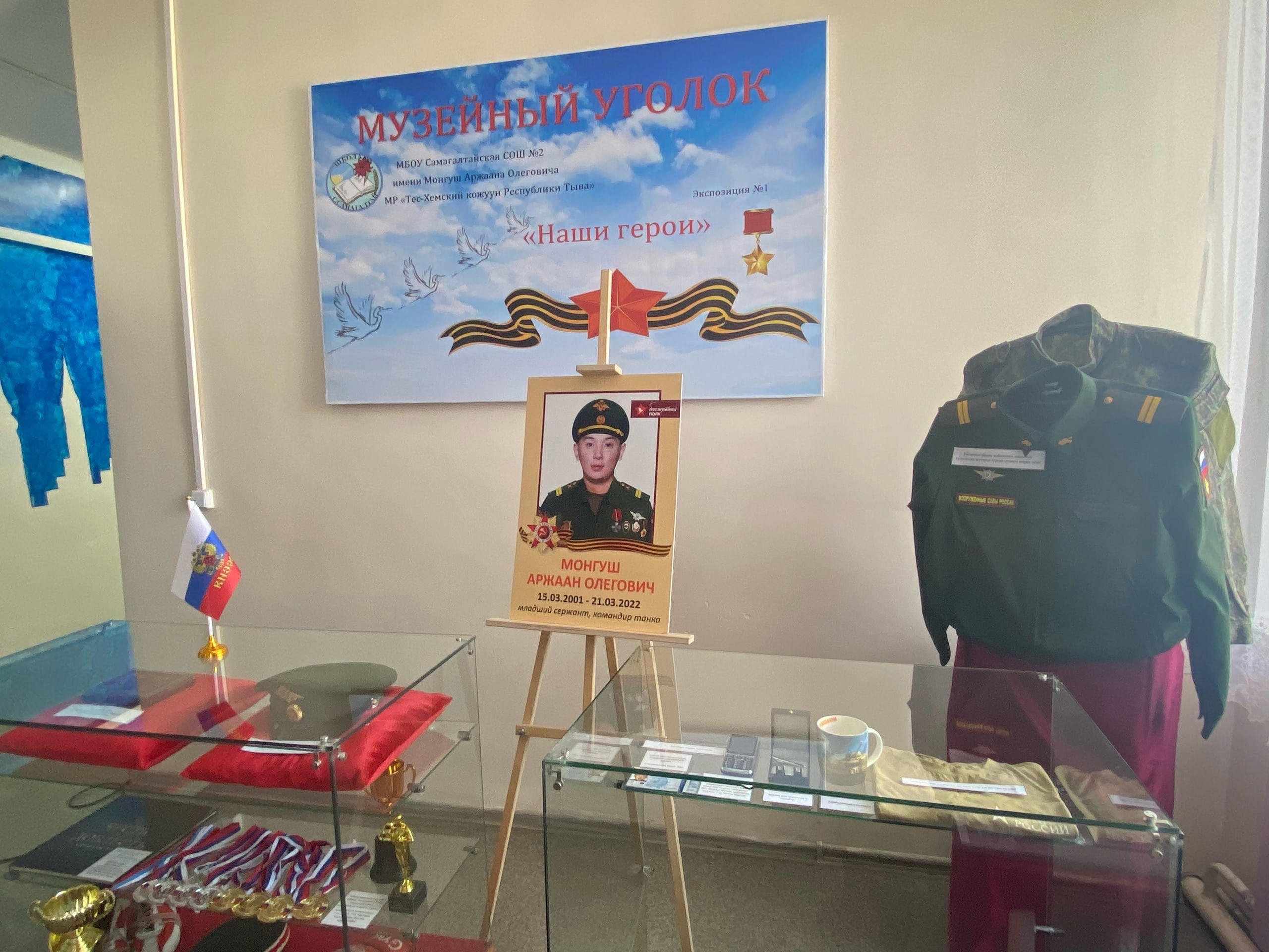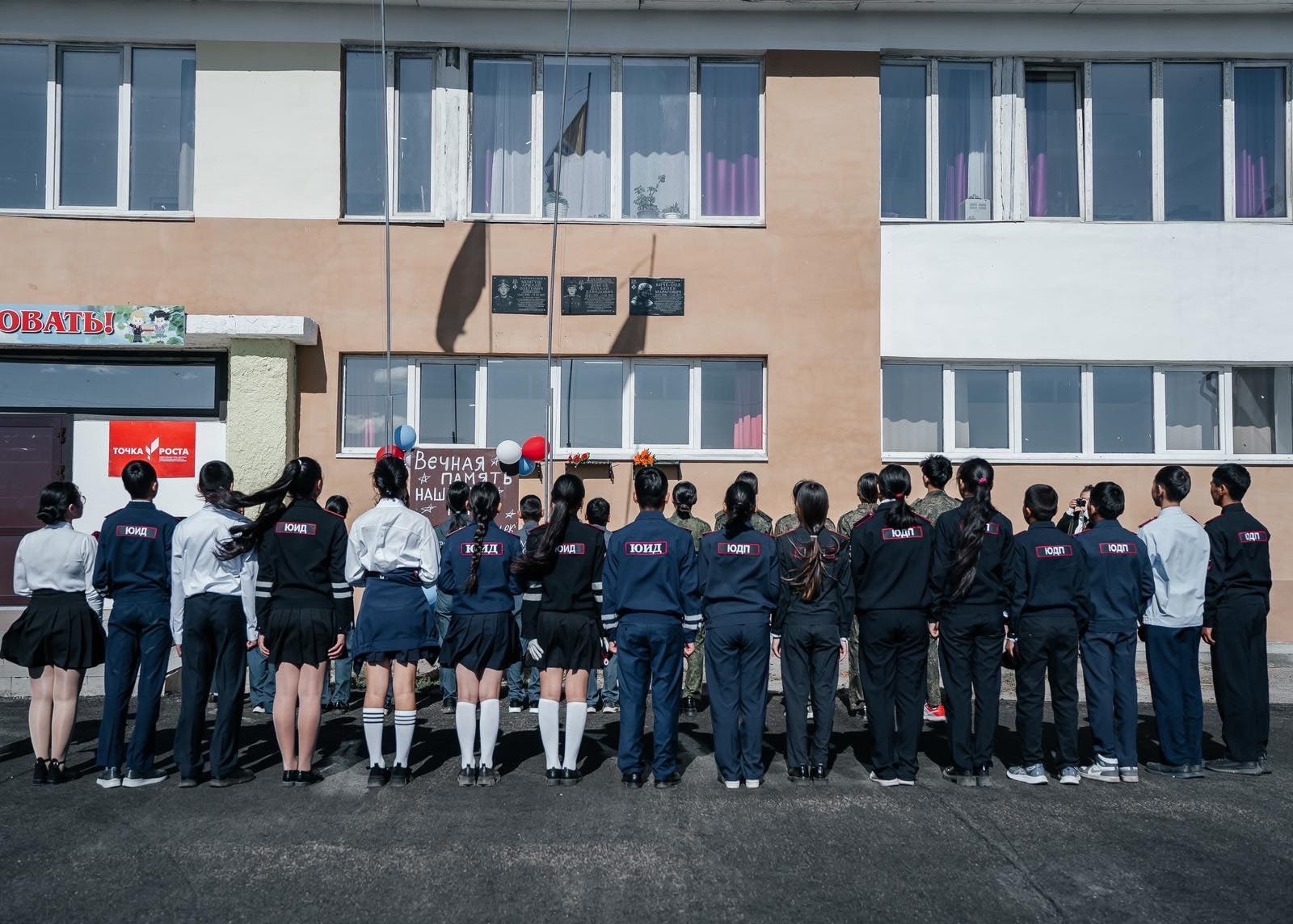 На стене двухэтажного типового здания школа №2 – пять мемориальных табличек участникам вторжения в Украину. С апреля 2024 года школа официально называется в честь младшего сержанта танковых войск Аржаана Монгуша, погибшего под Изюмом в Харьковской области через месяц после начала войны. В официальных некрологах родители Монгуша, который служил по контракту с 2020 года, рассказывали, как он успешно занимался боксом и любил пельмени – по-тувински "манчикей".