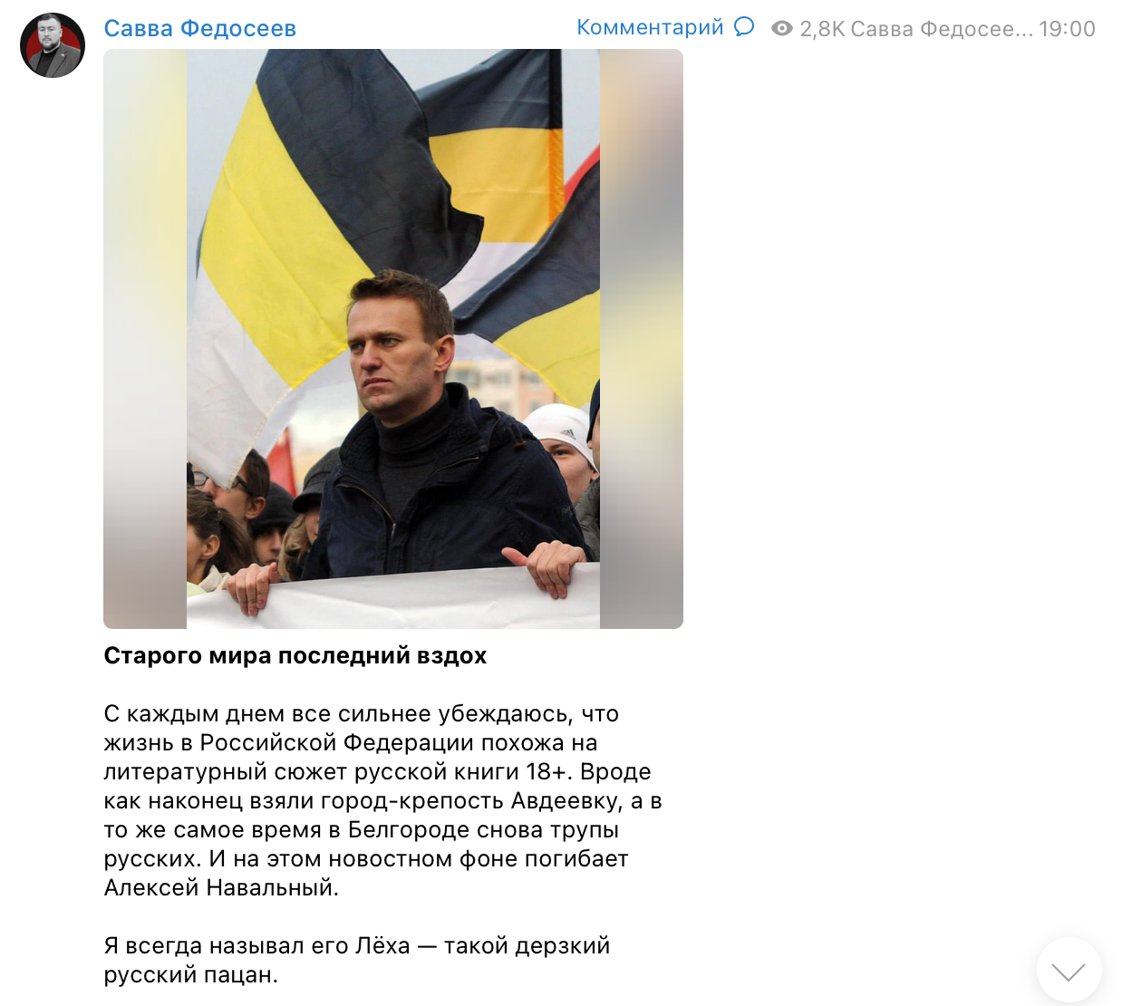 Савва Федосеев опубликовал фотографию Навального в своем телеграм-канале 16 февраля 2024 года, когда стало известно о гибели политика в колонии. На снимке Навальный запечатлен на фоне черно-желто-белых имперских флагов на «Русском марше» в Москве в 2011 году.