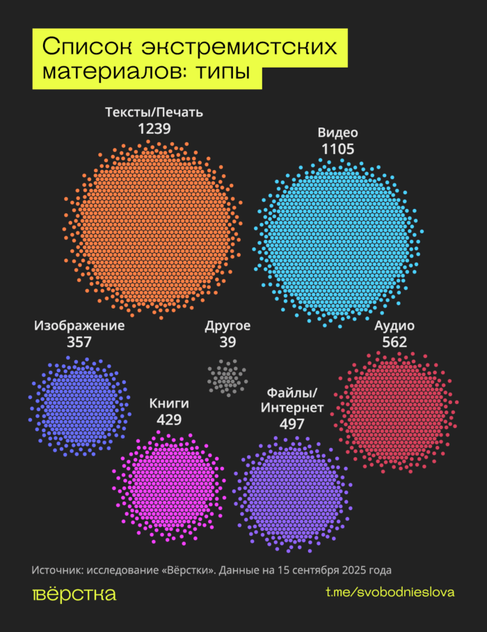 С 1 сентября 2025 года в России вступил в силу закон, который предусматривает штрафы за «умышленный поиск» экстремистских материалов в интернете. К сентябрю 2025 года официально признаны экстремистскими 5239 материалов (в списке почти 5,5 тысяч записей, но среди них есть исключённые). «Вёрстка» изучила весь федеральный список Минюста целиком и рассказывает, что именно в России признают экстремизмом и какие запросы теперь опасно вбивать в поисковики.