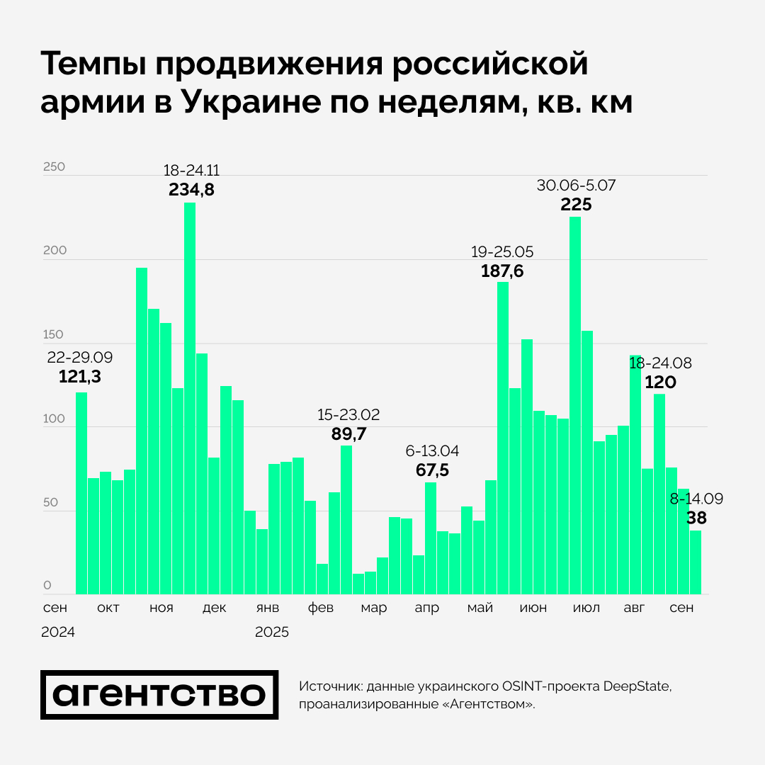 - Всего за первую половину сентября российские военные захватили 102 кв. км. Это меньше средней недельной скорости продвижения России во время летнего наступления — 120 кв. км за семь дней.