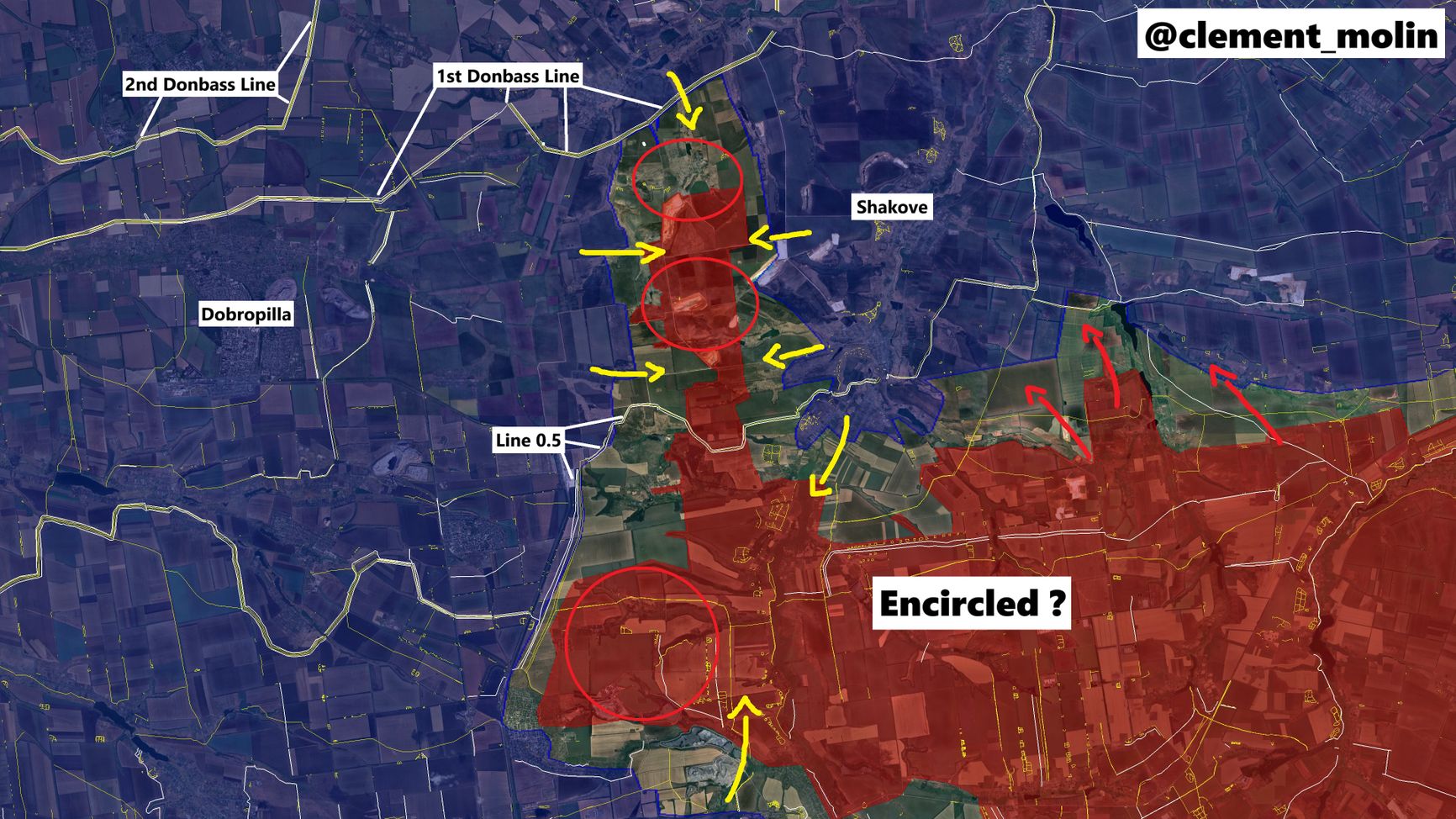 OSINT-исследователь под ником Clément Molin скептически оценивает заявления об окружении российских подразделений в районе выступа на месте российского «прорыва» на Доброполье. На самом деле, по его оценке, после того как стало известно о блокировании «прорыва» и украинских контратаках, никакой достоверной информации с этого участка не поступало, и на самом деле даже командование сторон достоверно не знает, что там происходит. Зафиксировать украинские контратаки удается только по следам российских авиаударов по наступающим подразделениям на спутниковых снимках.