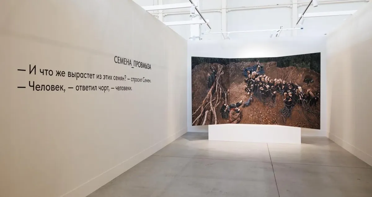 Композиция была выстроена художниками в реальности из живых людей, сфотографирована и размещена в пространстве ярмарки в формате триптиха. Образ действительно врезается в сознание зрителя и провоцирует на самые разные интерпретации. Работу также сопровождала довольно многозначительная цитата, как будто позаимствованная из русской классики: «— И что же вырастет из этих семян, спросил Семен? — Человек, — ответил чорт, — человеки». Как бы то ни было, этот групповой портрет, как мне показалось, действительно имеет самое непосредственное отношение к современности и отражает трагическое мироощущение, созвучное нашей эпохе.