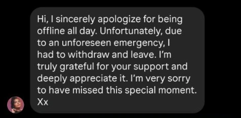 «К сожалению, из-за непредвиденной чрезвычайной ситуации мне пришлось отказаться от участия и уехать. Мне очень жаль, что я пропущу этот особенный момент», — ответила артистка в сообщениях Instagram.