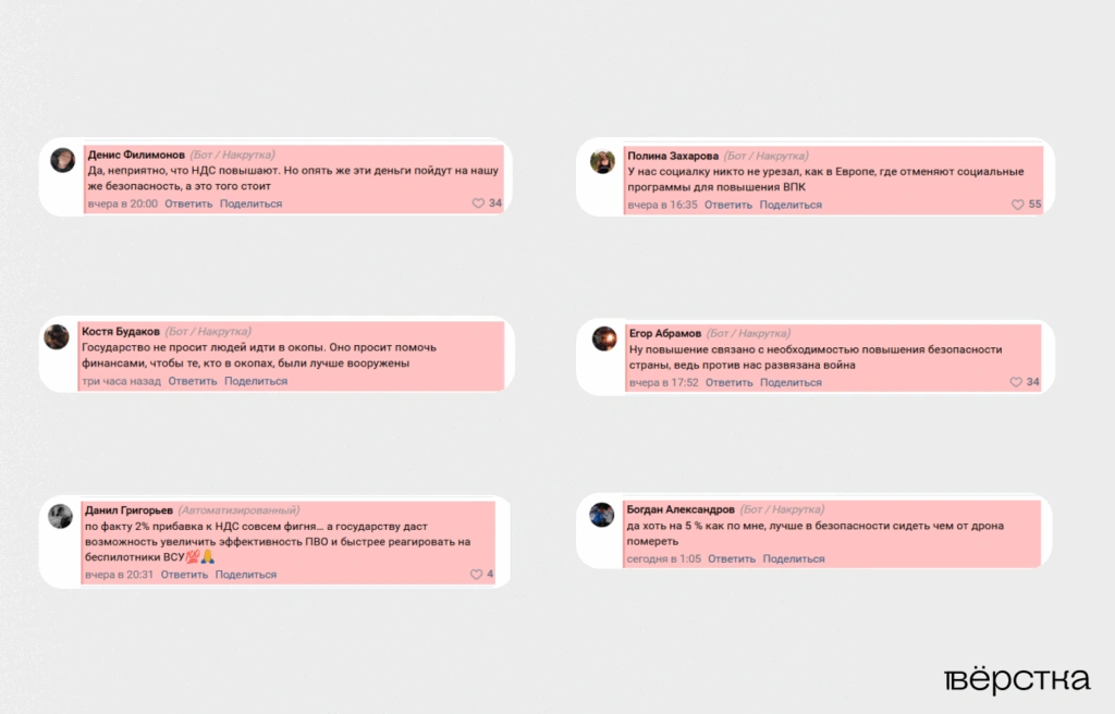 Основной нарратив ботов заключается в том, что средства, полученные с увеличенного НДС, пойдут «на оборону» и помогут тем, кто участвует в войне с Украиной. «Государство не просит людей идти в окопы. Оно просит помочь финансами, чтобы те, кто в окопах, были лучше вооружены», — пишут боты.
