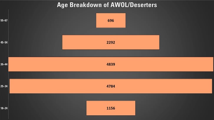 - Средний возраст дезертира — 37 лет, пишет Frontelligence Insight. Чаще всего оставляют место службы люди в возрасте 35−44 лет, за ними следует группа 25−34-летних. Вероятно, это отражает общую структуру российской армии, полагают авторы исследования.